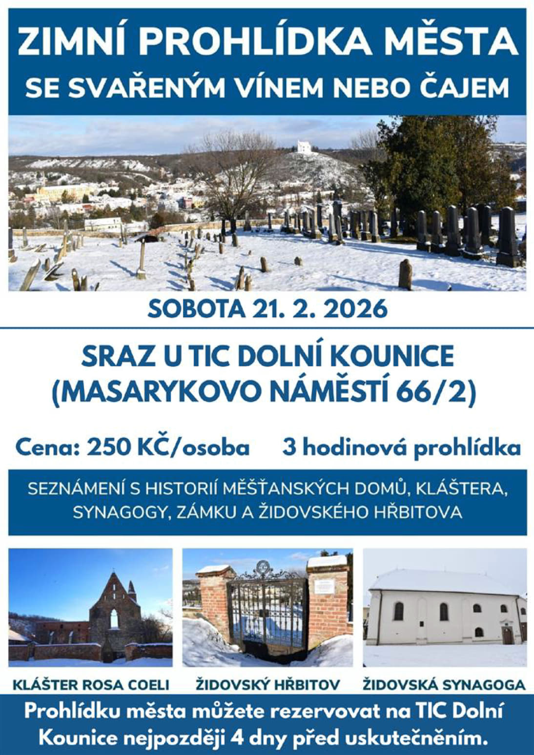 Sraz u TIC na Masarykově náměstí. Cena 250 Kč/os. Rezervace min. 4 dny předem v TIC nutná, tel. 513 030 427 nebo e-mailu tic@dolnikounice.cz